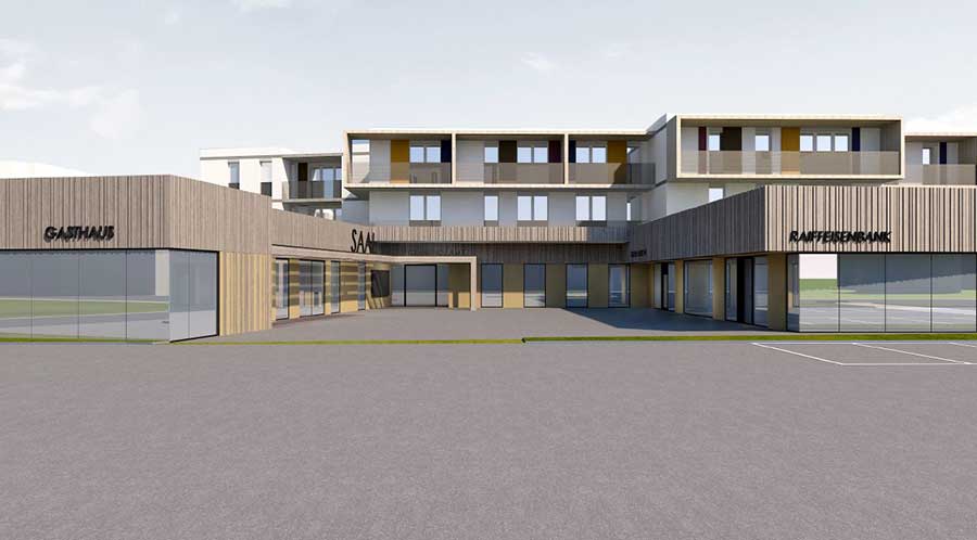 Auf der 2.278,00 m2 großen Nutzfläche sind ein neues Gemeindeamt, acht Wohnungen, ein Lokal, ein Friseur, eine Filiale der Raiffeisenbank Region Schallaburg, ein Co-Working-Space und ein öffentliches WC, geplant. Mitte 2024 soll das neue Ortszentrum fertiggestellt werden.
